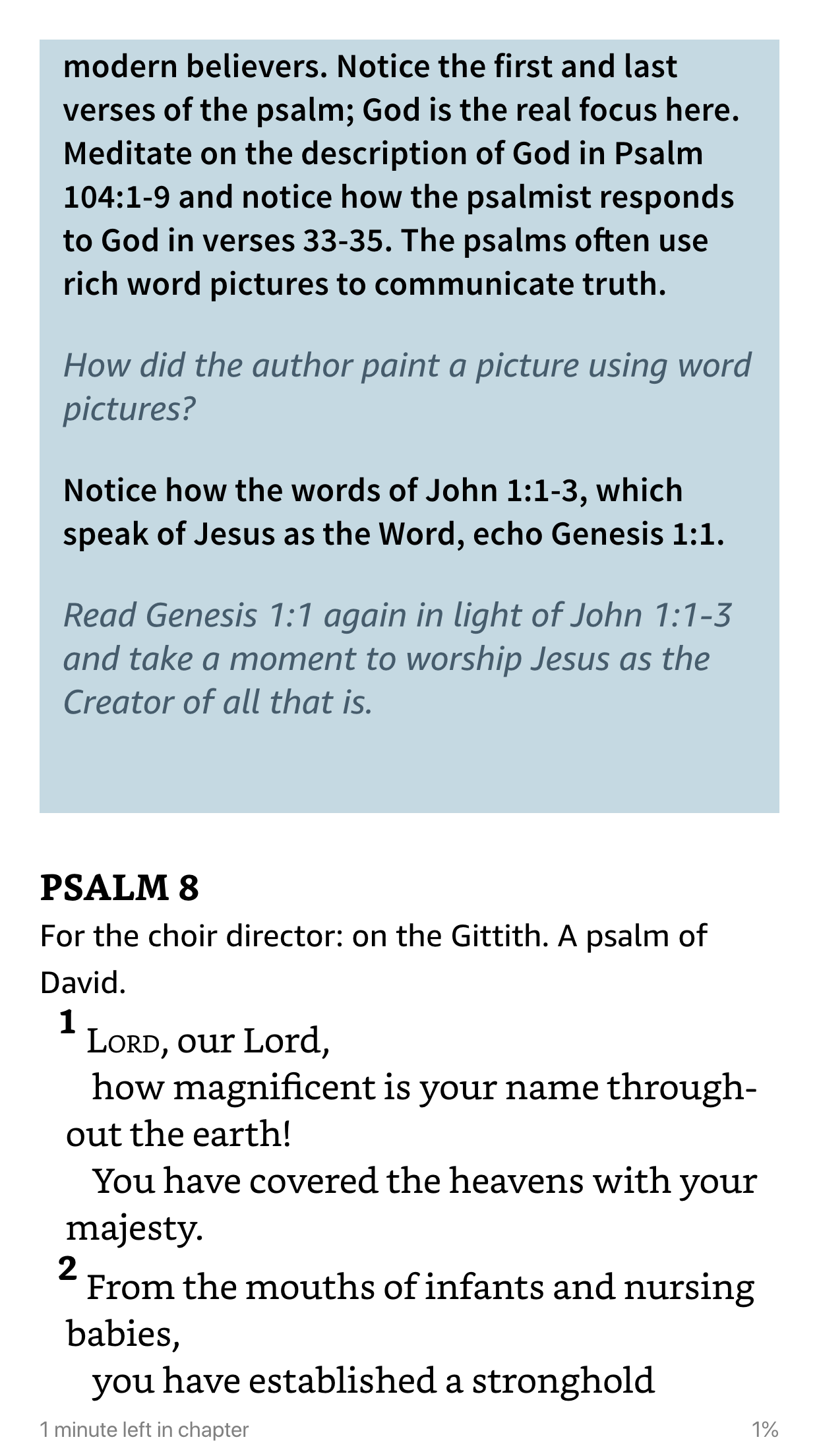 Notice the connection between Psalm 8 and Genesis 1–2; we are just a little lower than the heavenly beings.