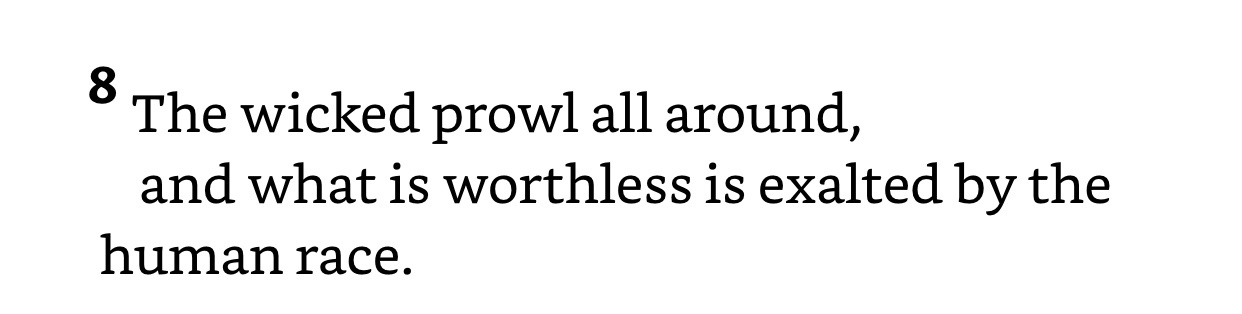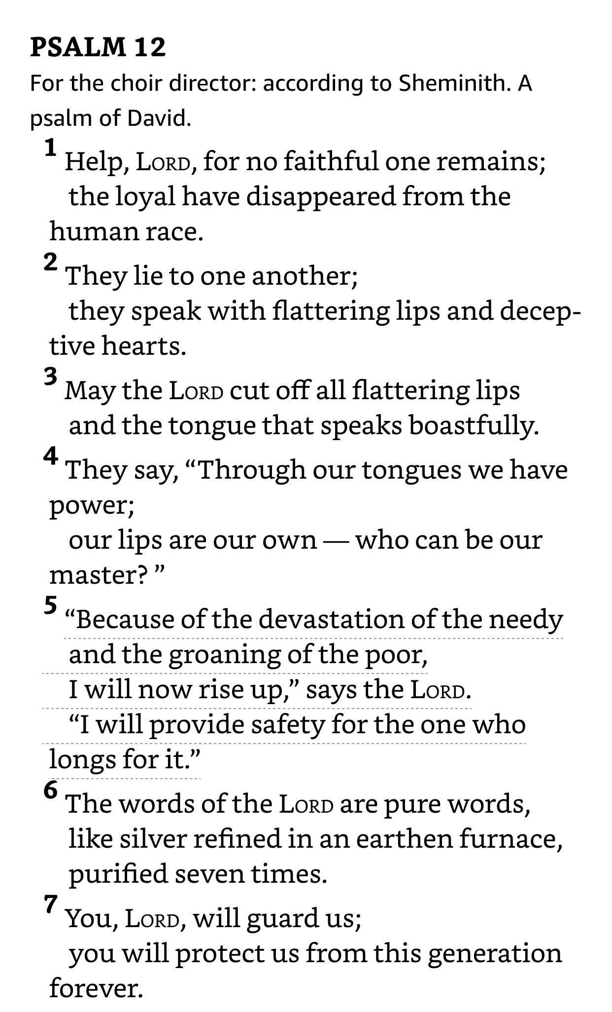 Although Psalm 12 was written by David and refers to Israel, we can see the similarities to our society and realize nothing has changed over the centuries. We still want to be our own god (who can be our master?) and celebrate wrong as right (what is worthless is exalted by the human race). But God is ever present (you, LORD, will guard us; you will protect us from this generation forever) and faithful, even when we are not.