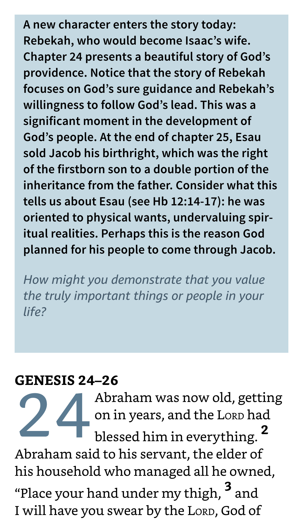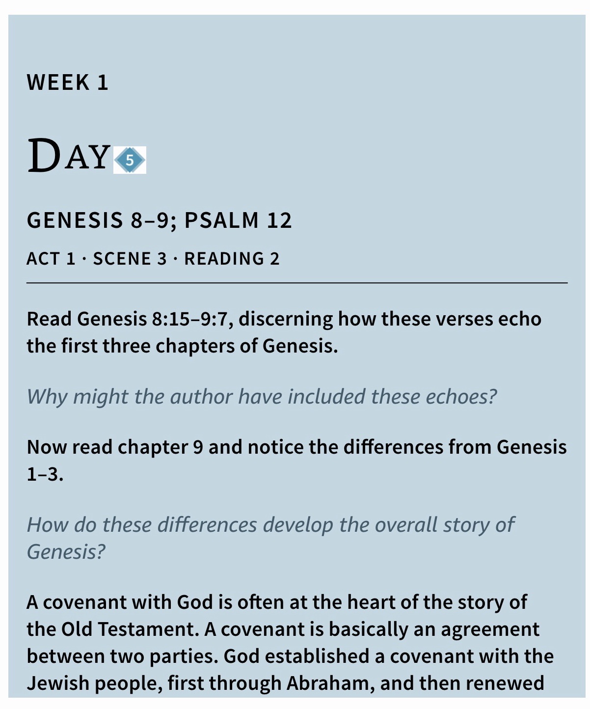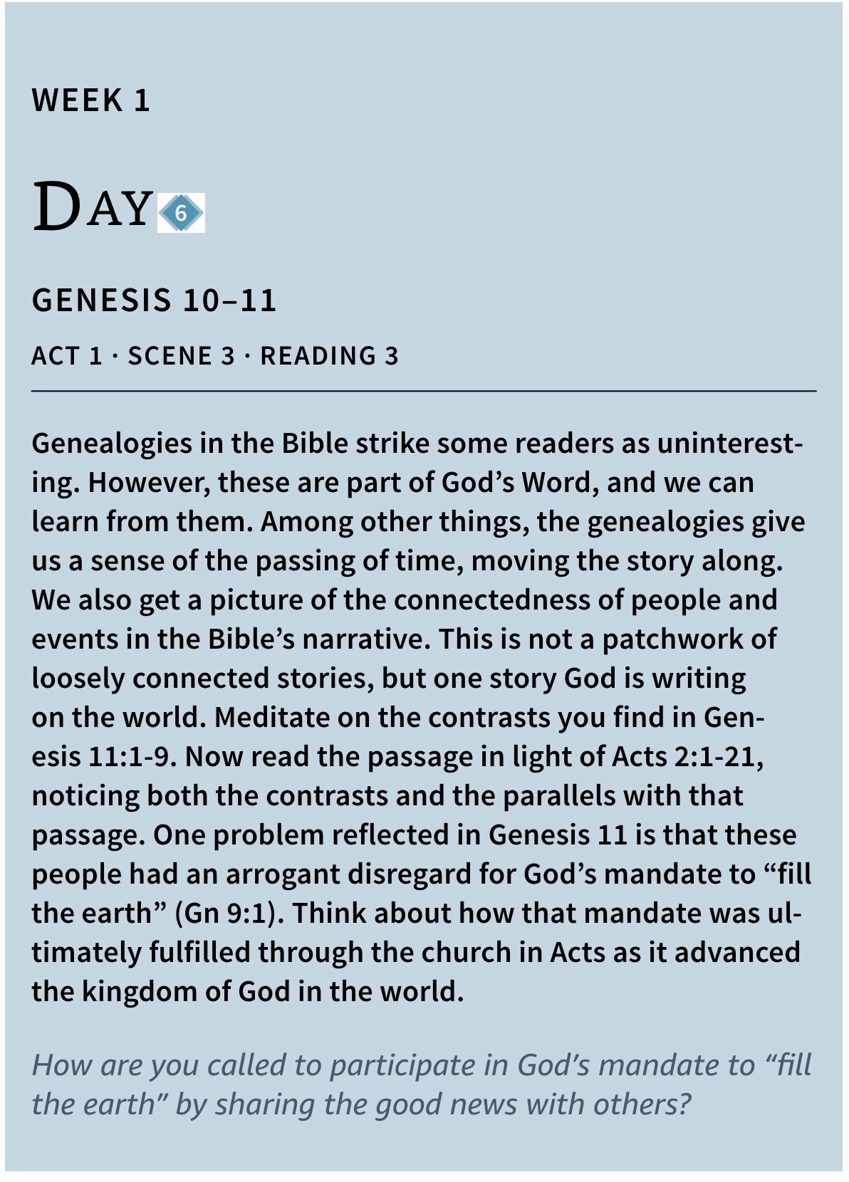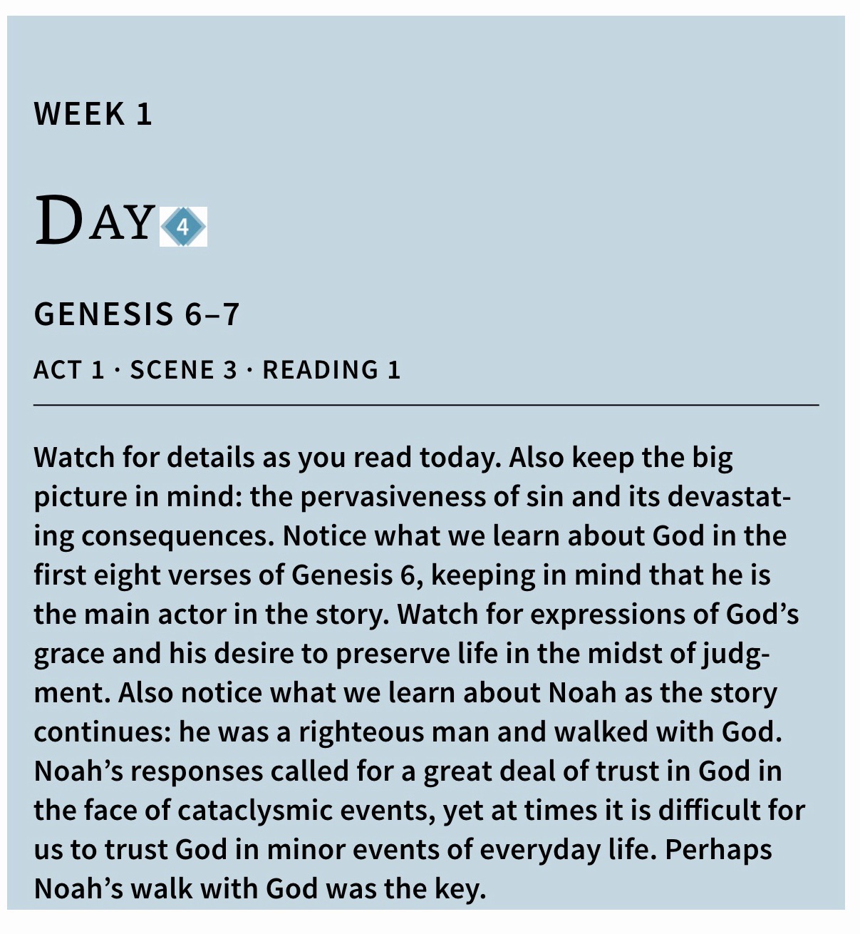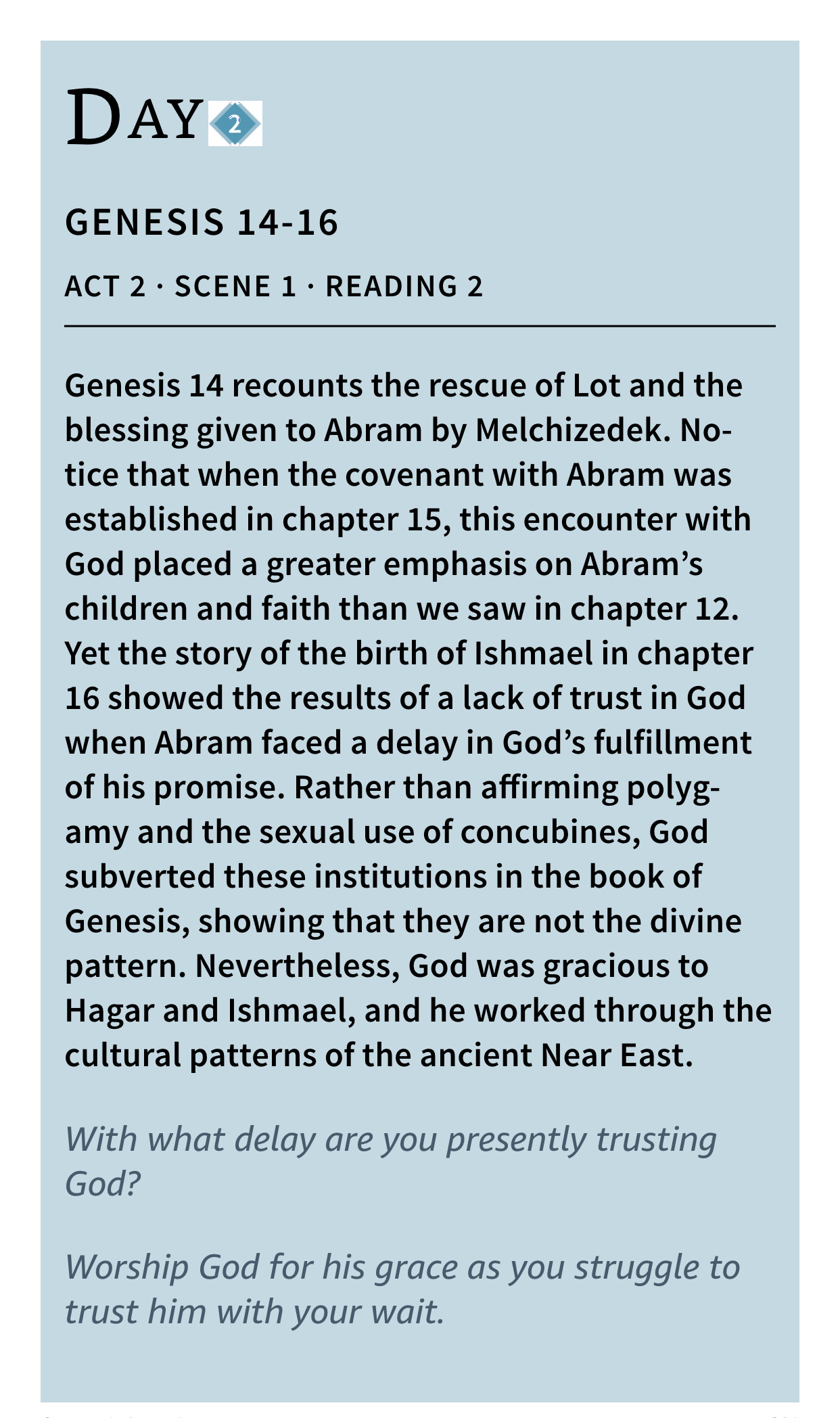 According to the Day by Day Chronological Bible that we are reading, and where these daily readings are posted from, God remains the central character in Act 2 (which is the next setting for several weeks). He sets events in motion by making covenants and working through persons whom he has chosen to further his purposes. The central human characters are members of a single family down through the generations. Starting with Abraham and Sarah and through this family, God sent the Saviour, Jesus Christ. You will know Abraham and Sarah as Abram and Sarai of the Genealogy chapter of day 6, descendent of Shem, descendent of Noah, descendent of Seth, the son born to Adam and Eve after Cain killed Abel.